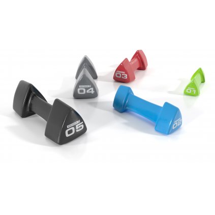 Vinylové činky mají pohodlný, ergonomický tvar a jasné značení hmotnosti. Jsou snadné na údržbu a citlivé pro podlahy každého studia či sálu.