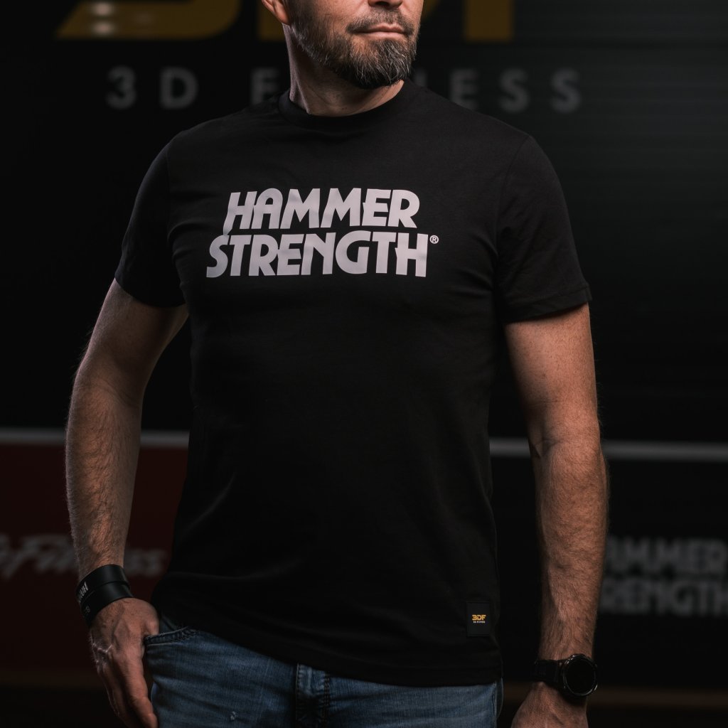 🔹 Velké bílé logo HAMMER STRENGTH na hrudi